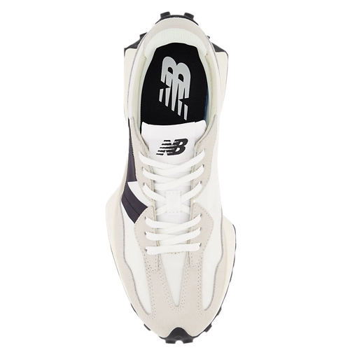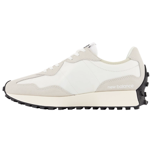 White sneaker with a black 'N' logo on a white background